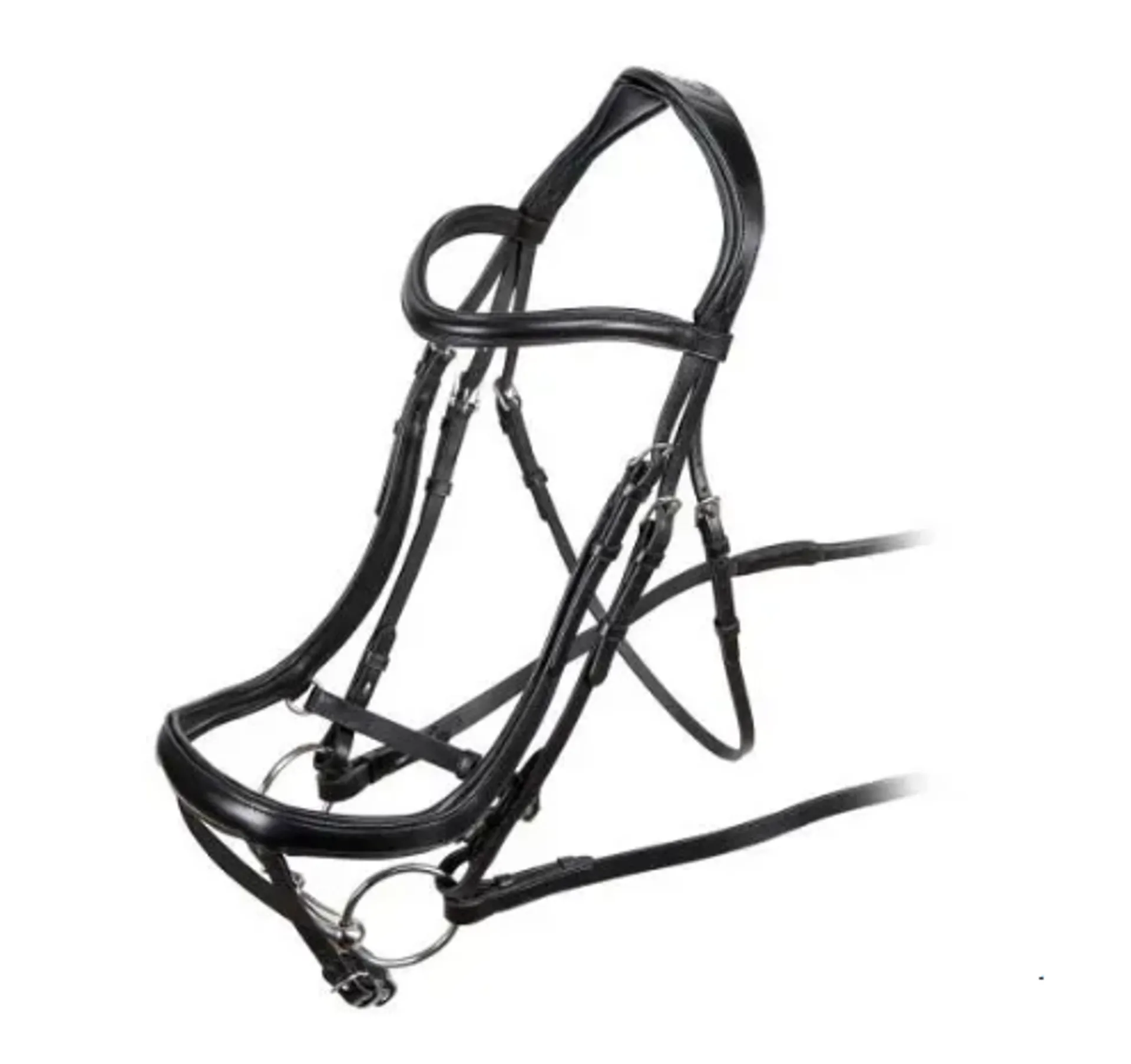 The curved noseband relieves compression from the cheekbones, jaw and sensitive nerve endings. The padded integrated noseband and flash strap give a greater spread of pressure creating a less restricted feeling for the horse.