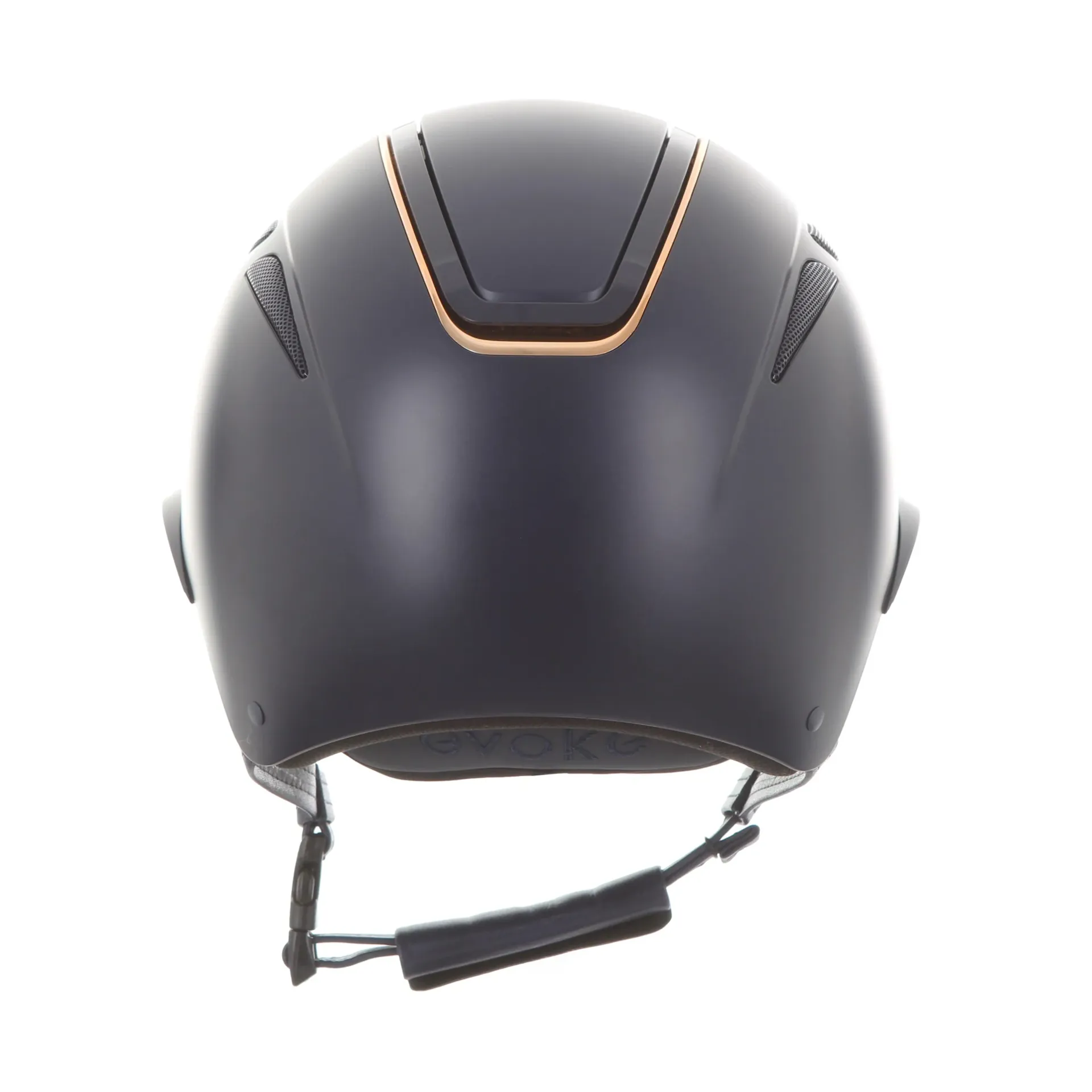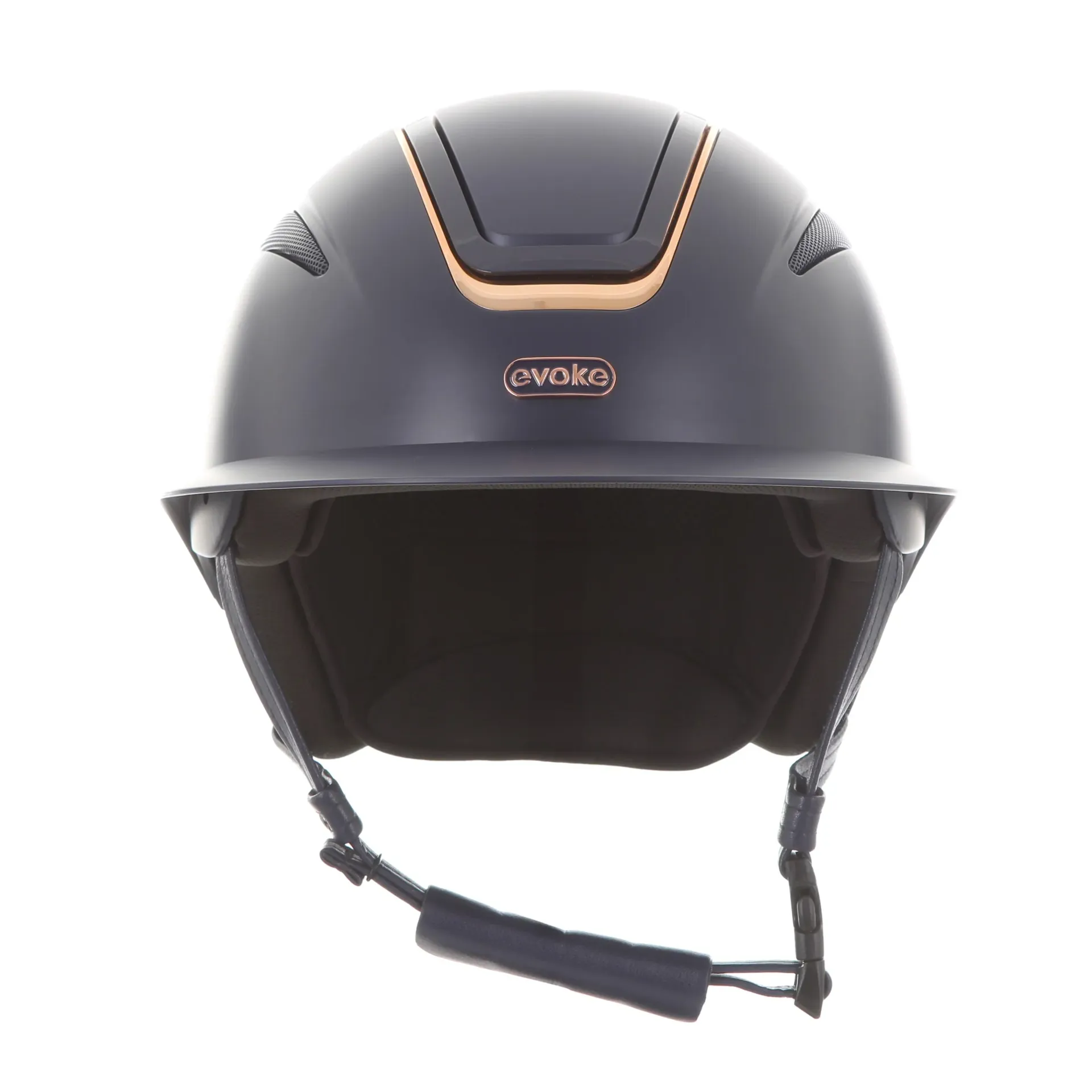 Callisto Wide peaked riding helmet in a matt navy finish with a beautiful rose gold frame. Stylish navy side vents are complimented by rose gold and navy evoke branding.