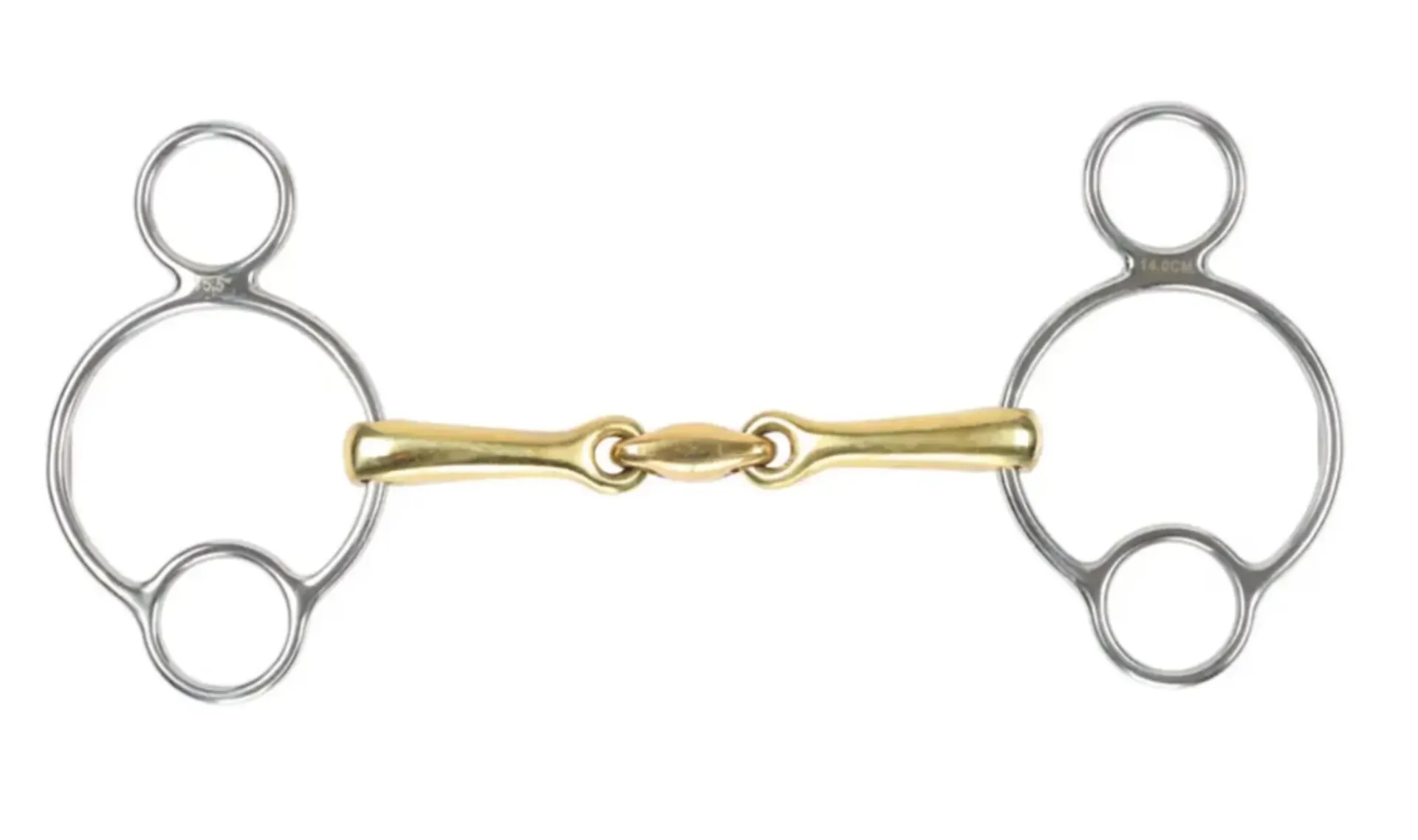 Combines poll pressure and leverage for a mild gag action. Brass alloy assists with salivation. Mouthpiece thickness: 14mm. Cheek height: 115mm (4.5, 5), 130mm (5.5, 6).