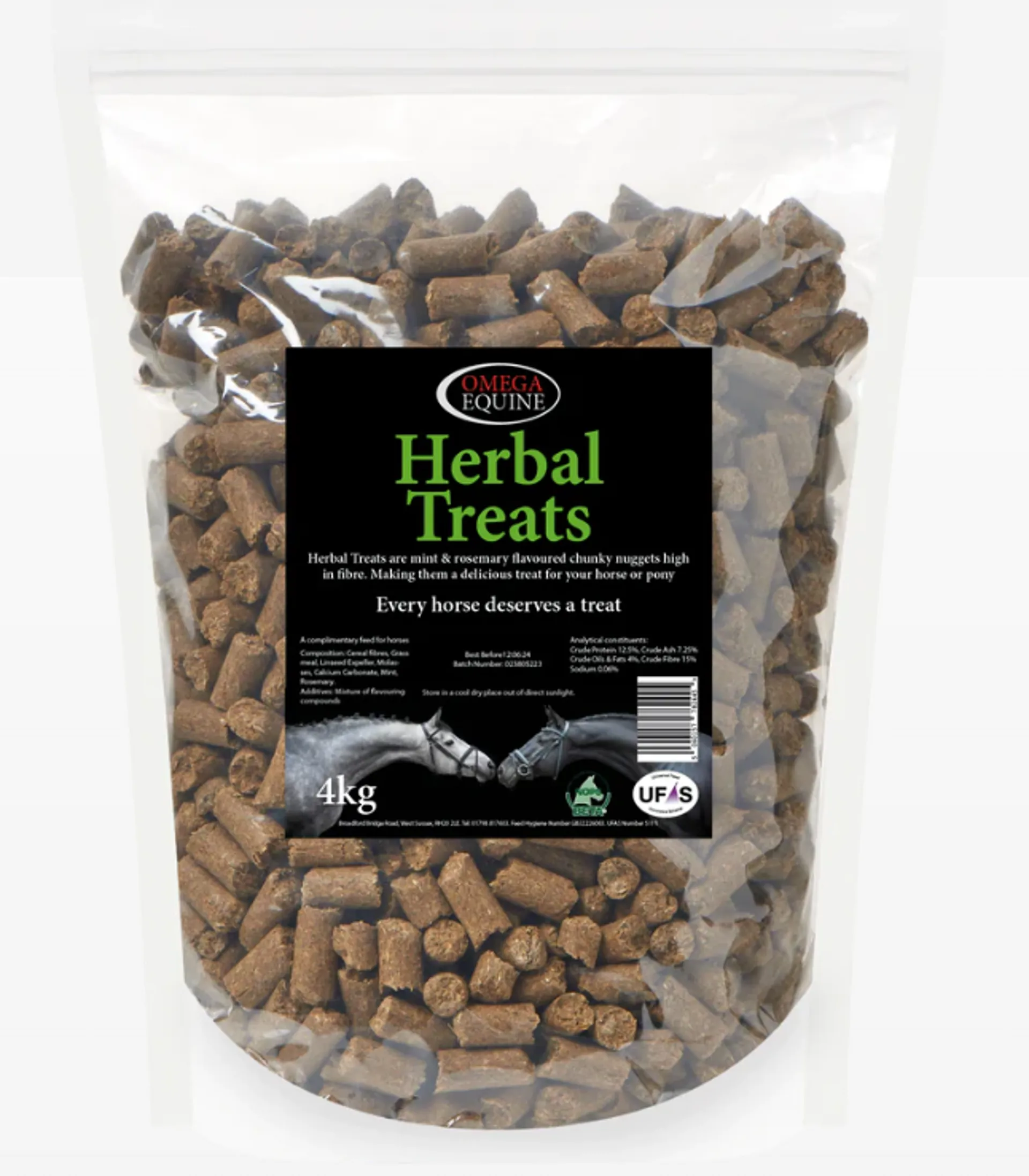Omega Equine Treats are available in Herbal Flavour and are packaged in ahandy resealable bag for storage.